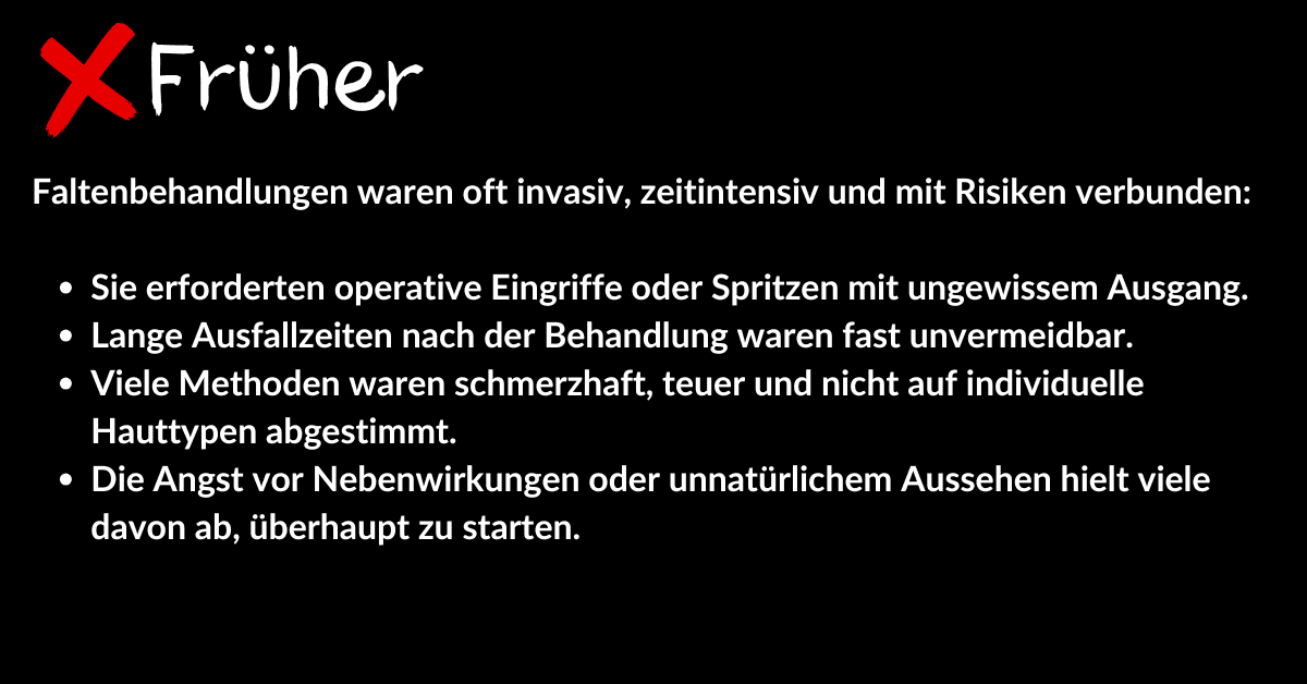 Viele Frauen sind unzufrieden mit zunehmenden Gesichtsfalten und dem sichtbaren Alterungsprozess ihrer Haut. Besonders störend empfinden sie Falten im Gesicht, die sie älter und müder wirken lassen. Gleichzeitig fehlt häufig das Vertrauen in invasive Eingriffe oder die Zeit für aufwändige Behandlungen.